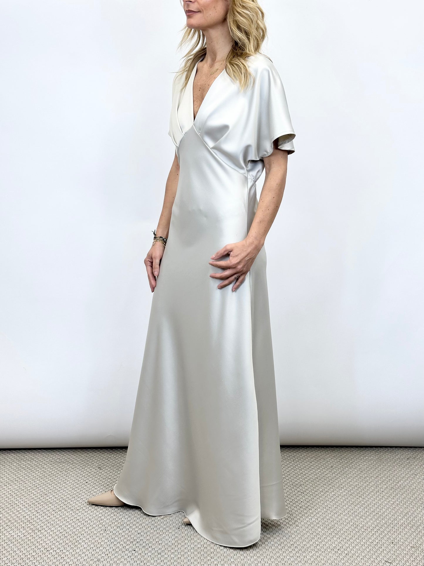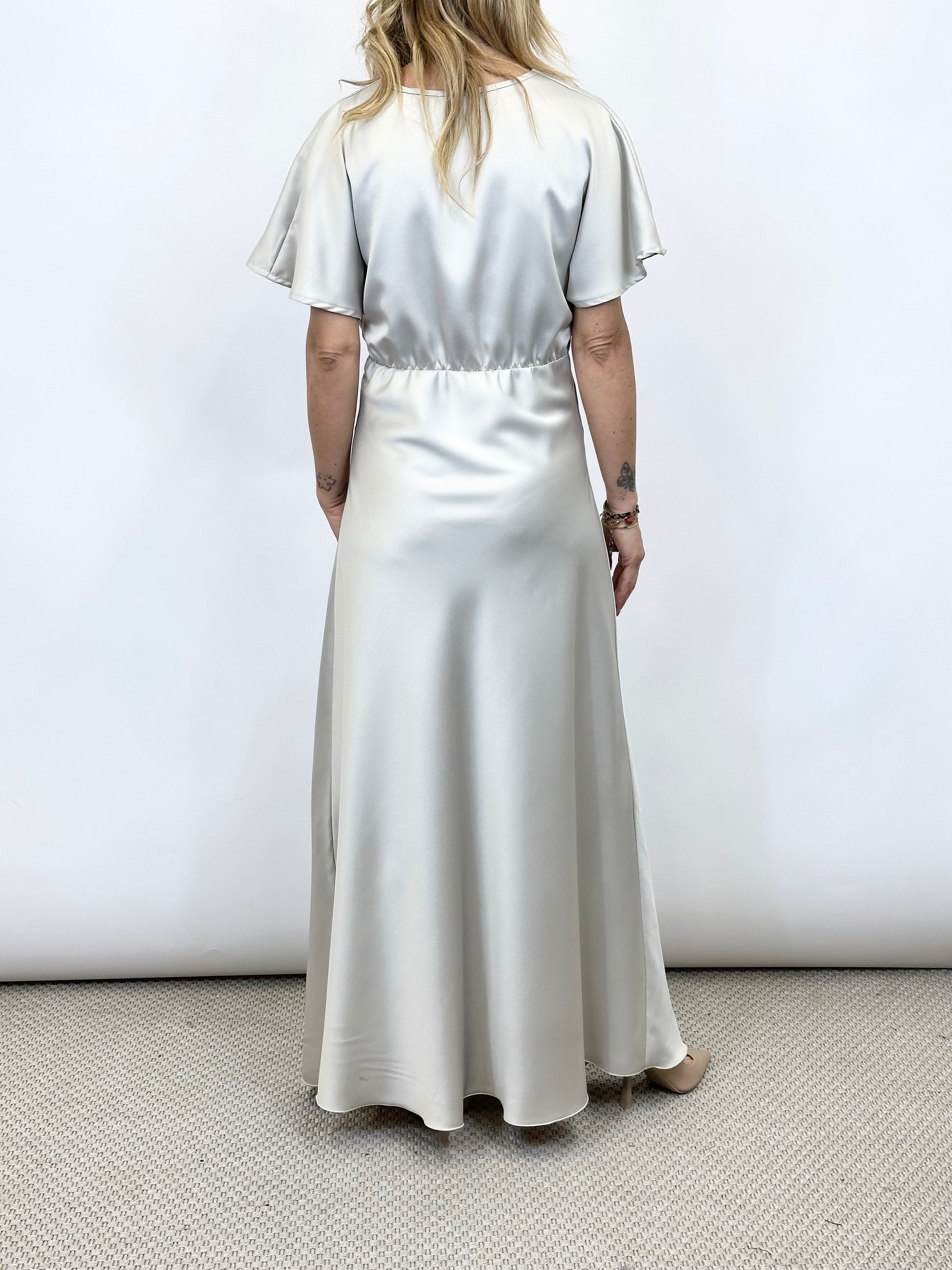 Abito lungo con scollo a v, taglio sotto il seno, manica corta, elastico nel retro. Vestibilità regolare.