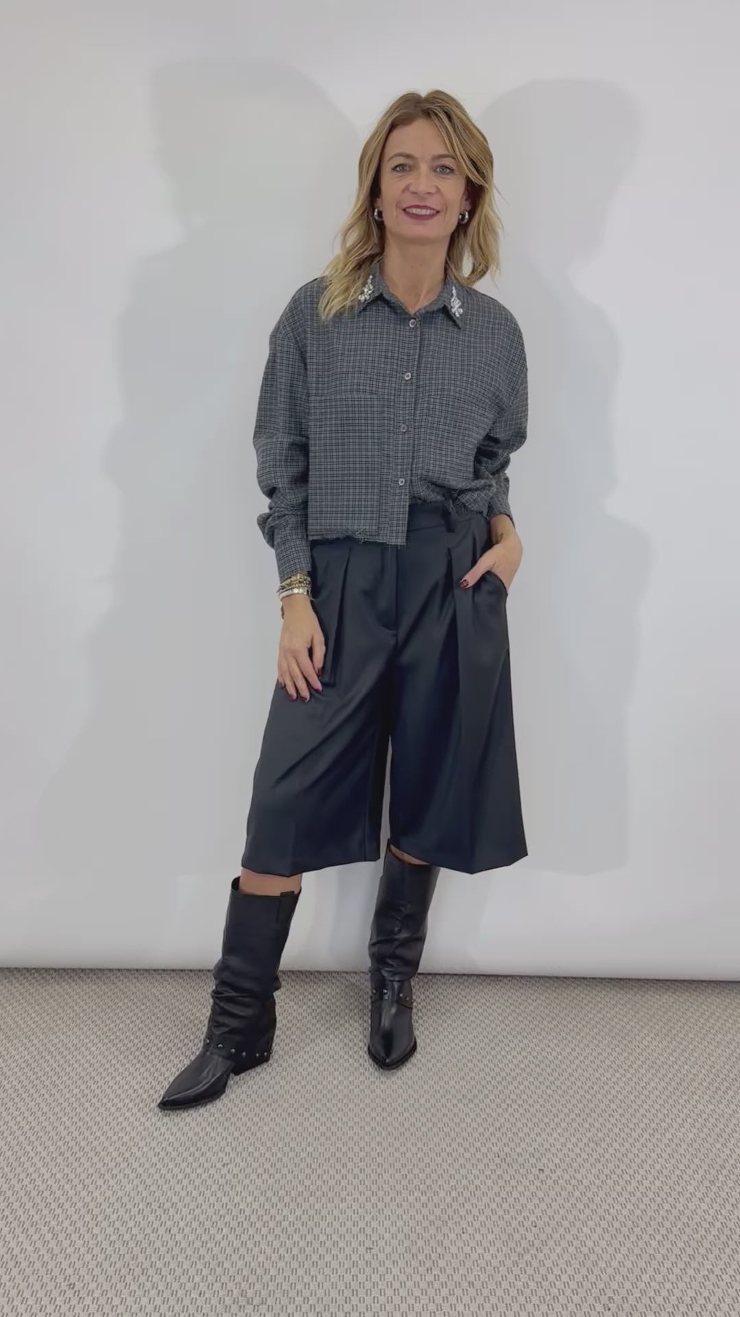 Bermuda ampio con pences. Chiusura con zip e bottone frontali. Passanti per cintura. Tasca a filetto sul retro.
