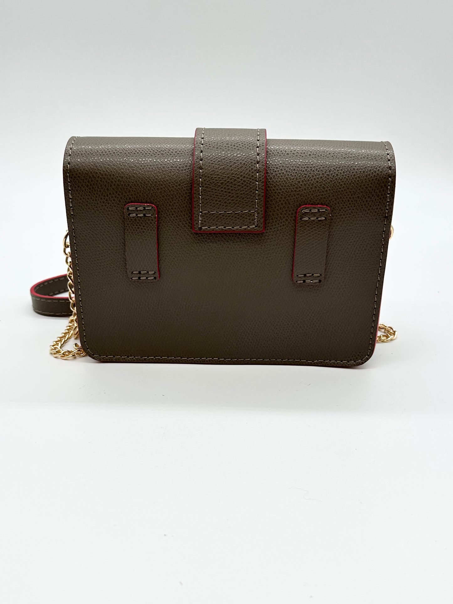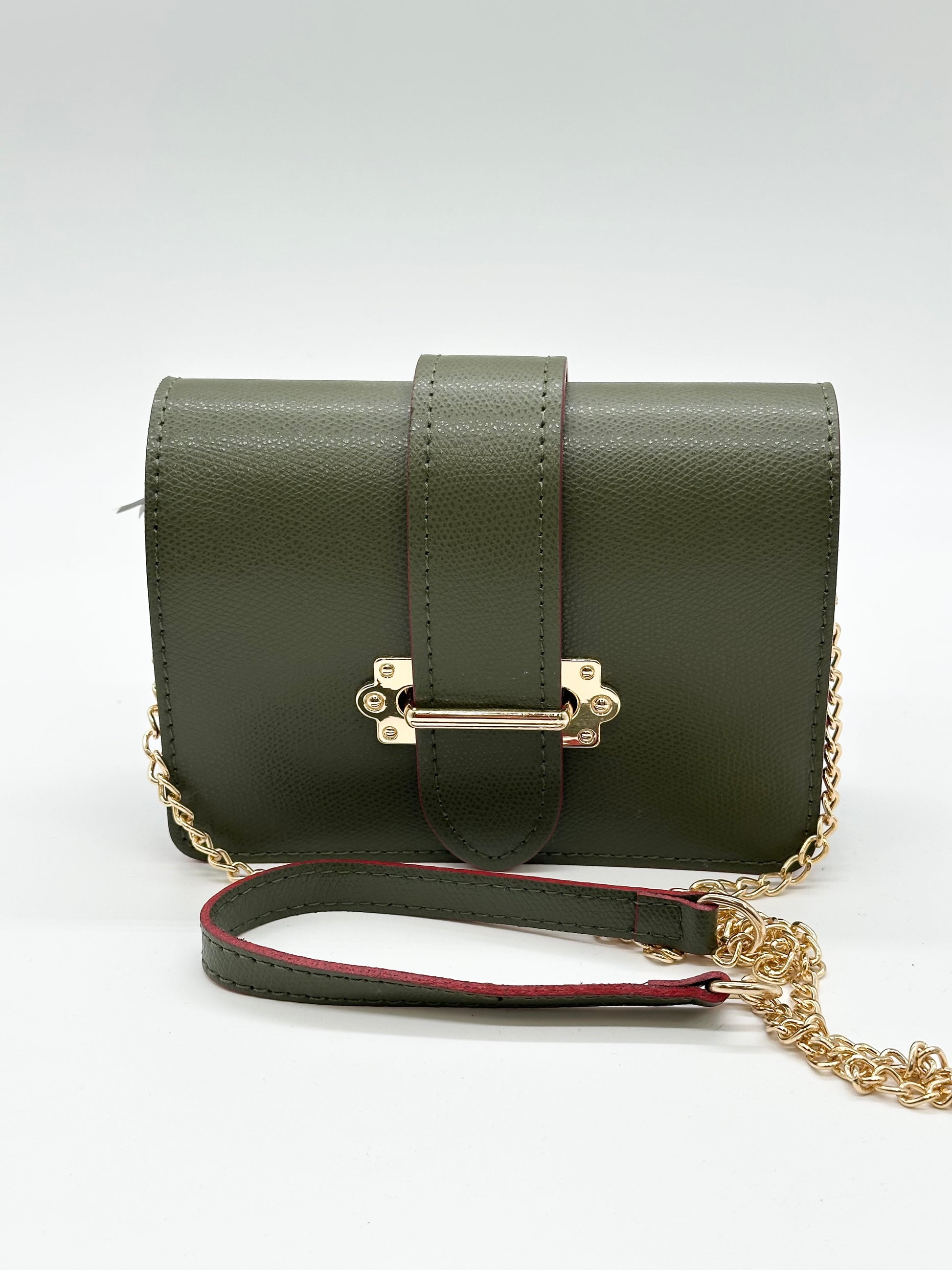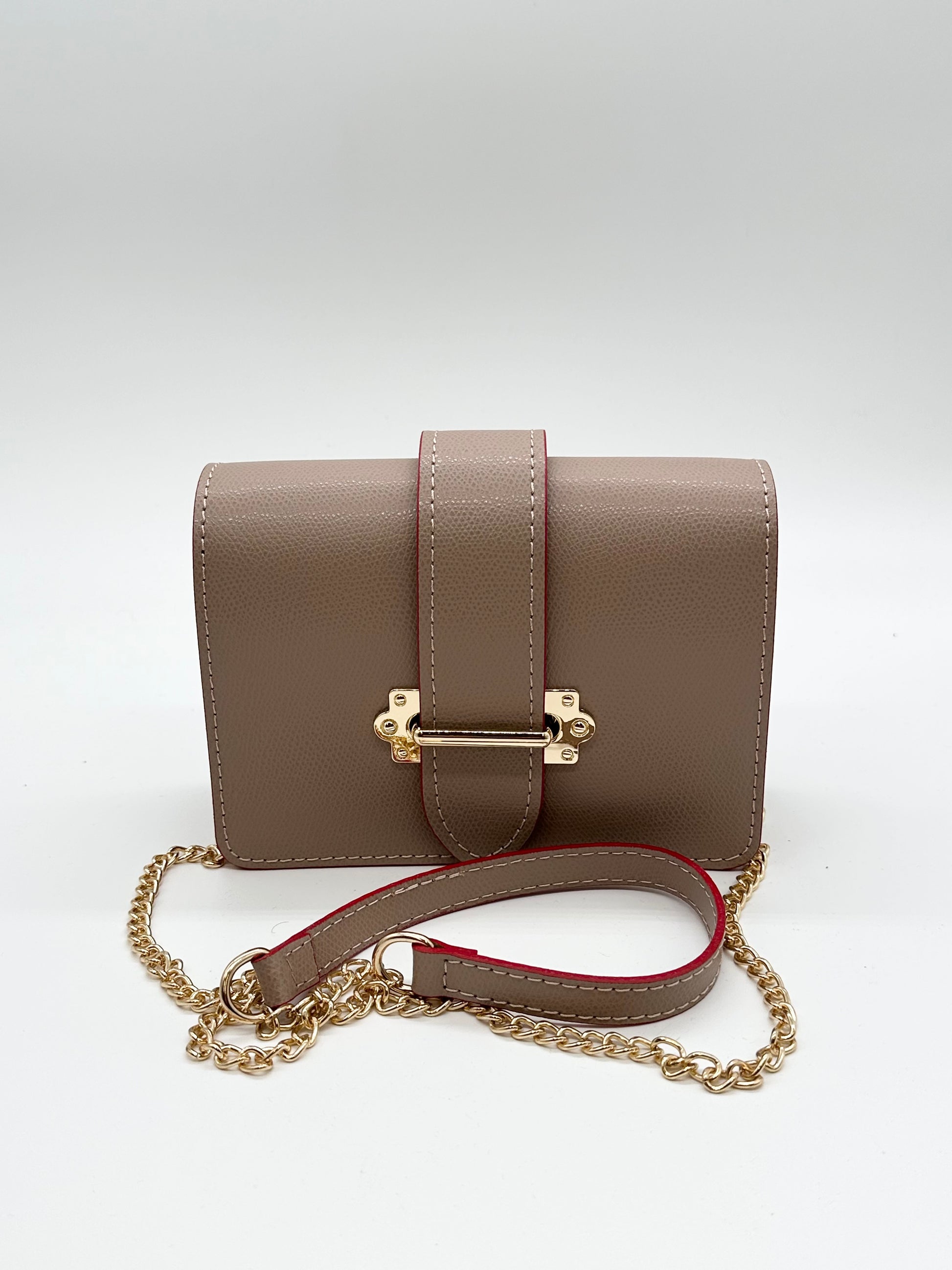 Esclusiva borsa da donna in pelle da portare anche come marsupio, chiusura con patta e fibbia in metallo oro, adatta perfettamente a qualsiasi outfit. Offre due tracolle. La tracolla in catena e pelle per indossare la borsa a tracolla , l'altra in pelle per indossarla come marsupio. Profilata in rosso.
