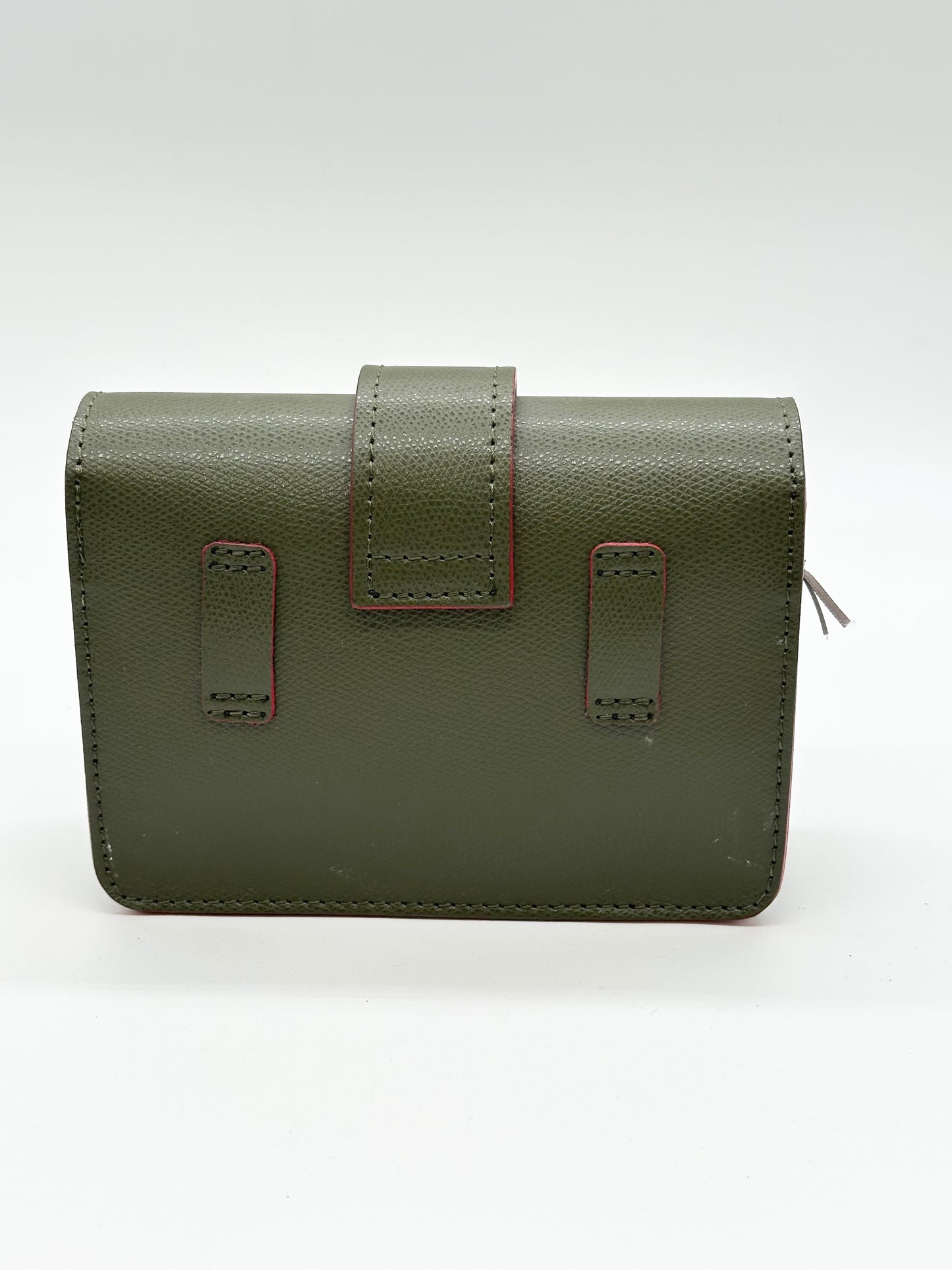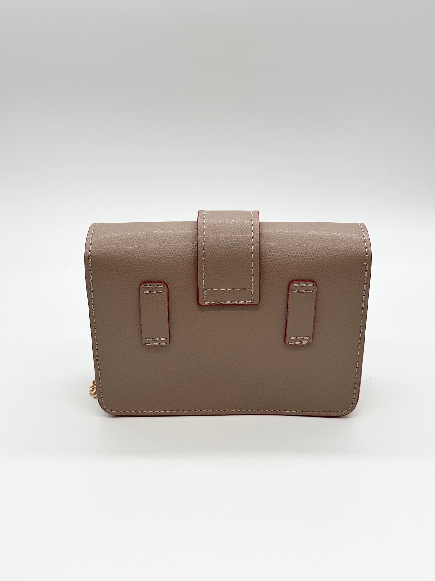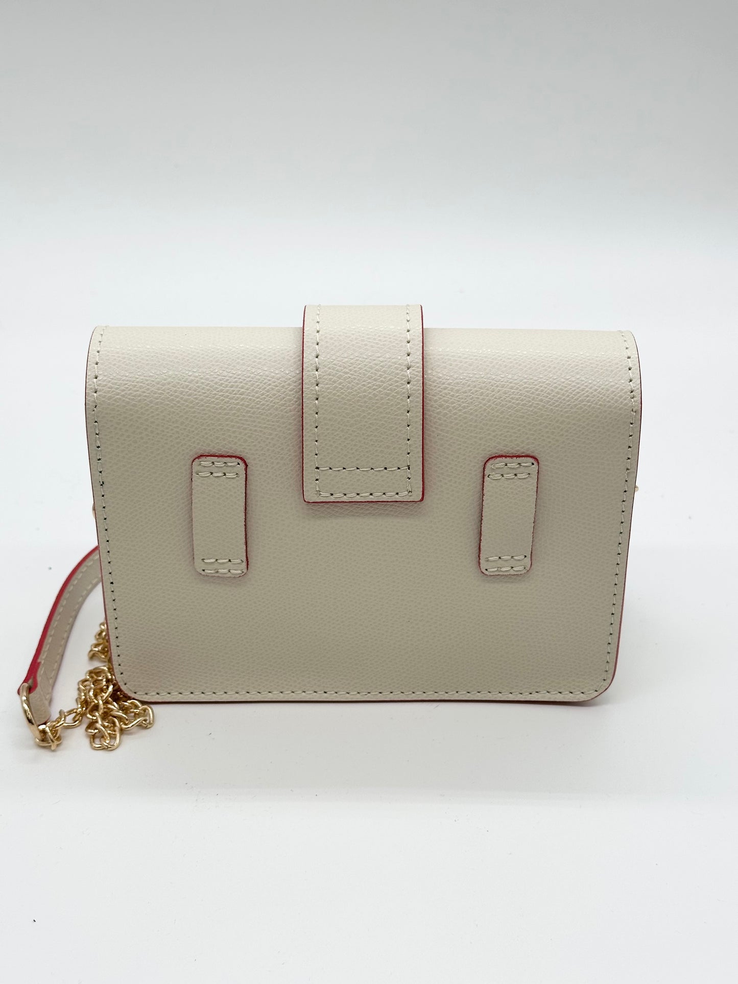 Esclusiva borsa da donna in pelle da portare anche come marsupio, chiusura con patta e fibbia in metallo oro, adatta perfettamente a qualsiasi outfit. Offre due tracolle. La tracolla in catena e pelle per indossare la borsa a tracolla , l'altra in pelle per indossarla come marsupio. Profilata in rosso.