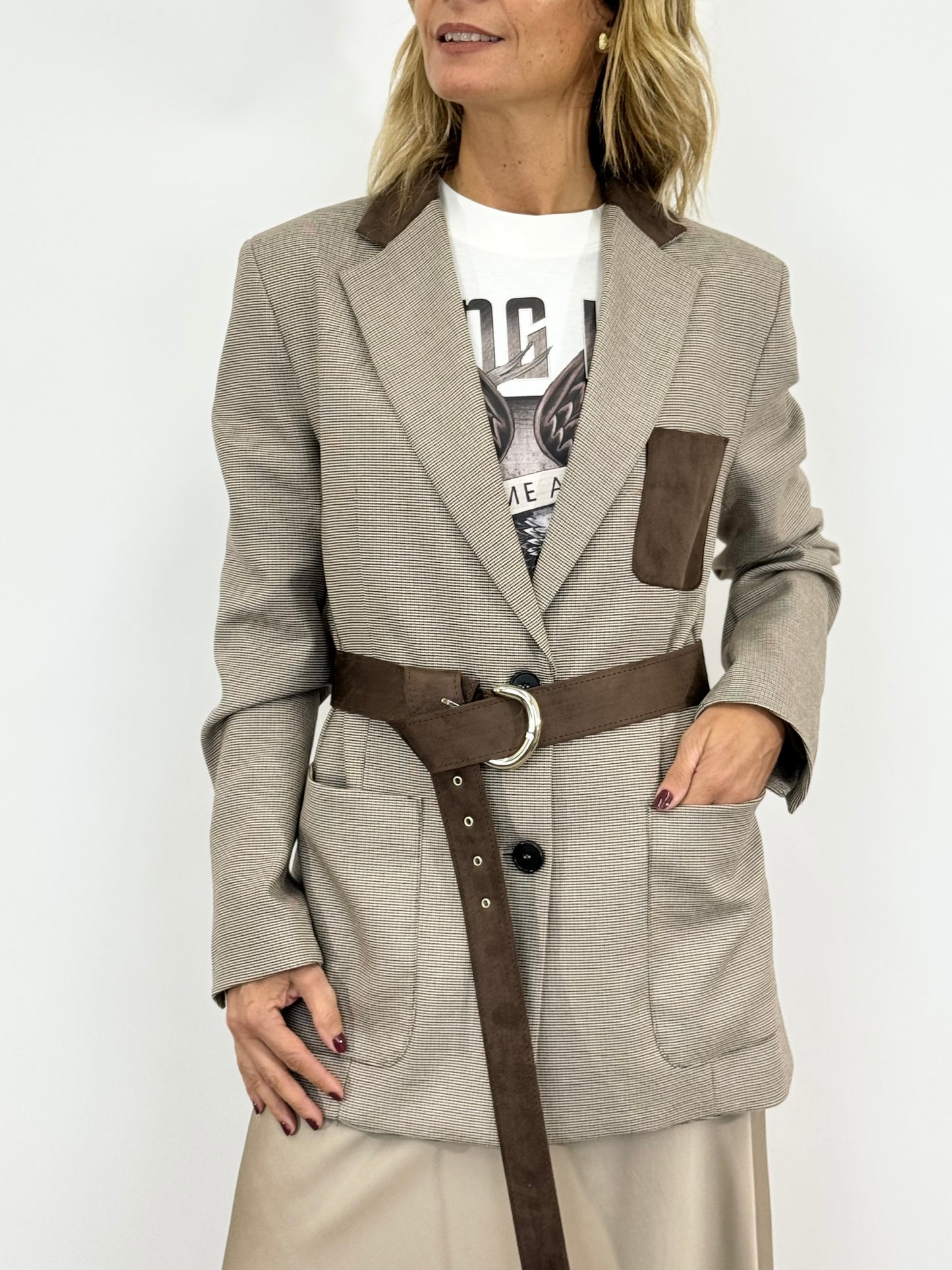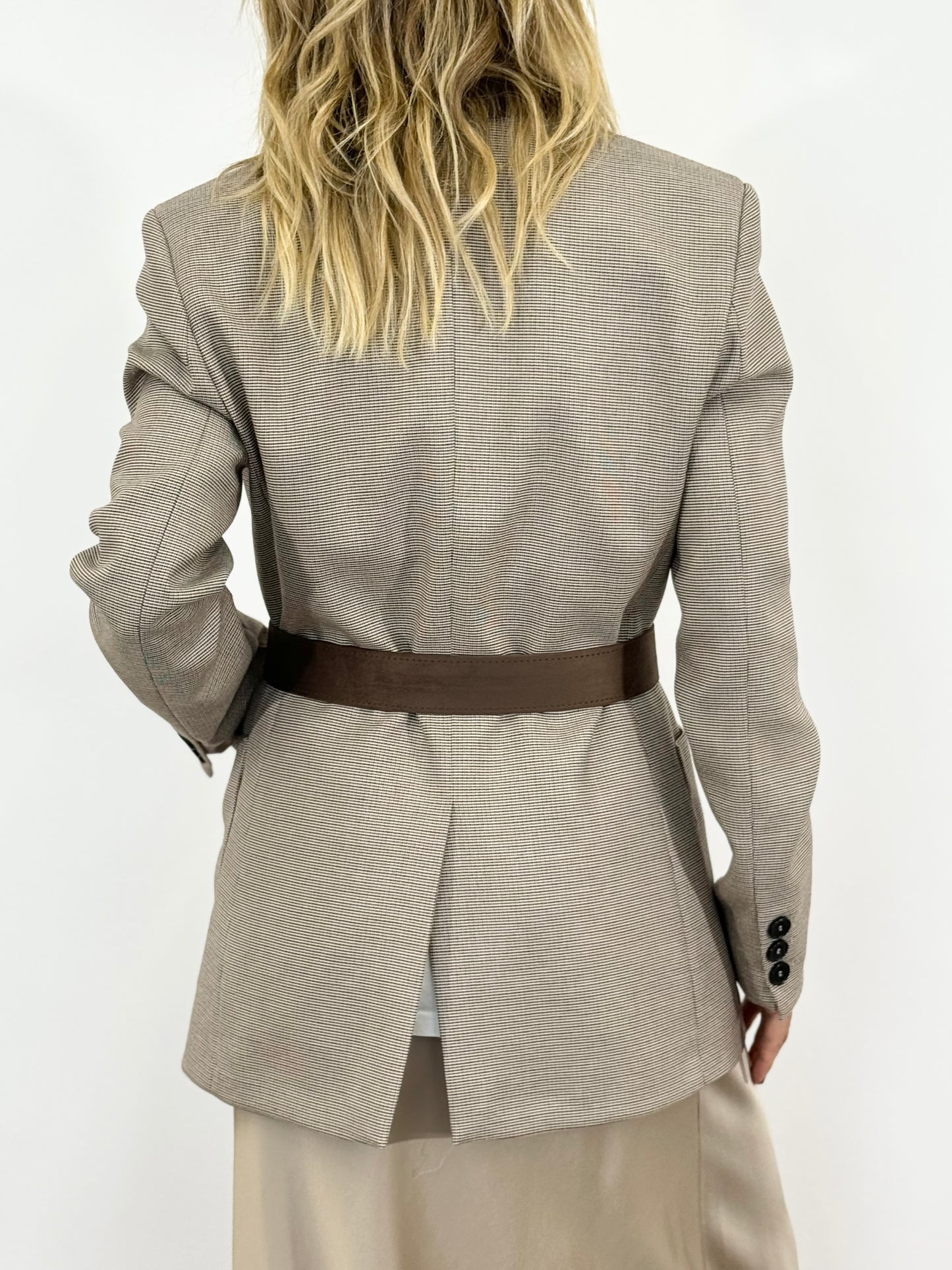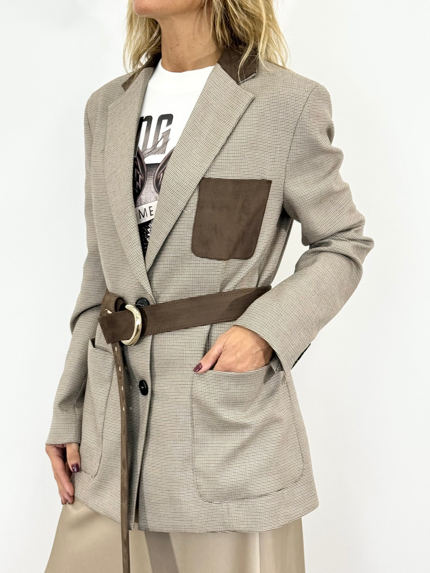 Giacca monopetto con un pie de poul piccolissimo, colletto e taschino in tessuto a contrasto, tasche a toppa frontali, dotata di cintura in dotazione.