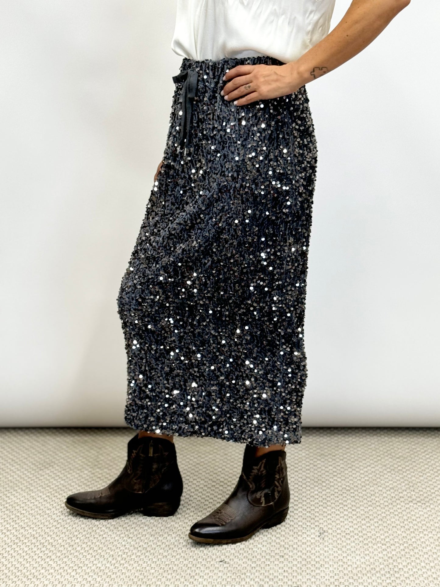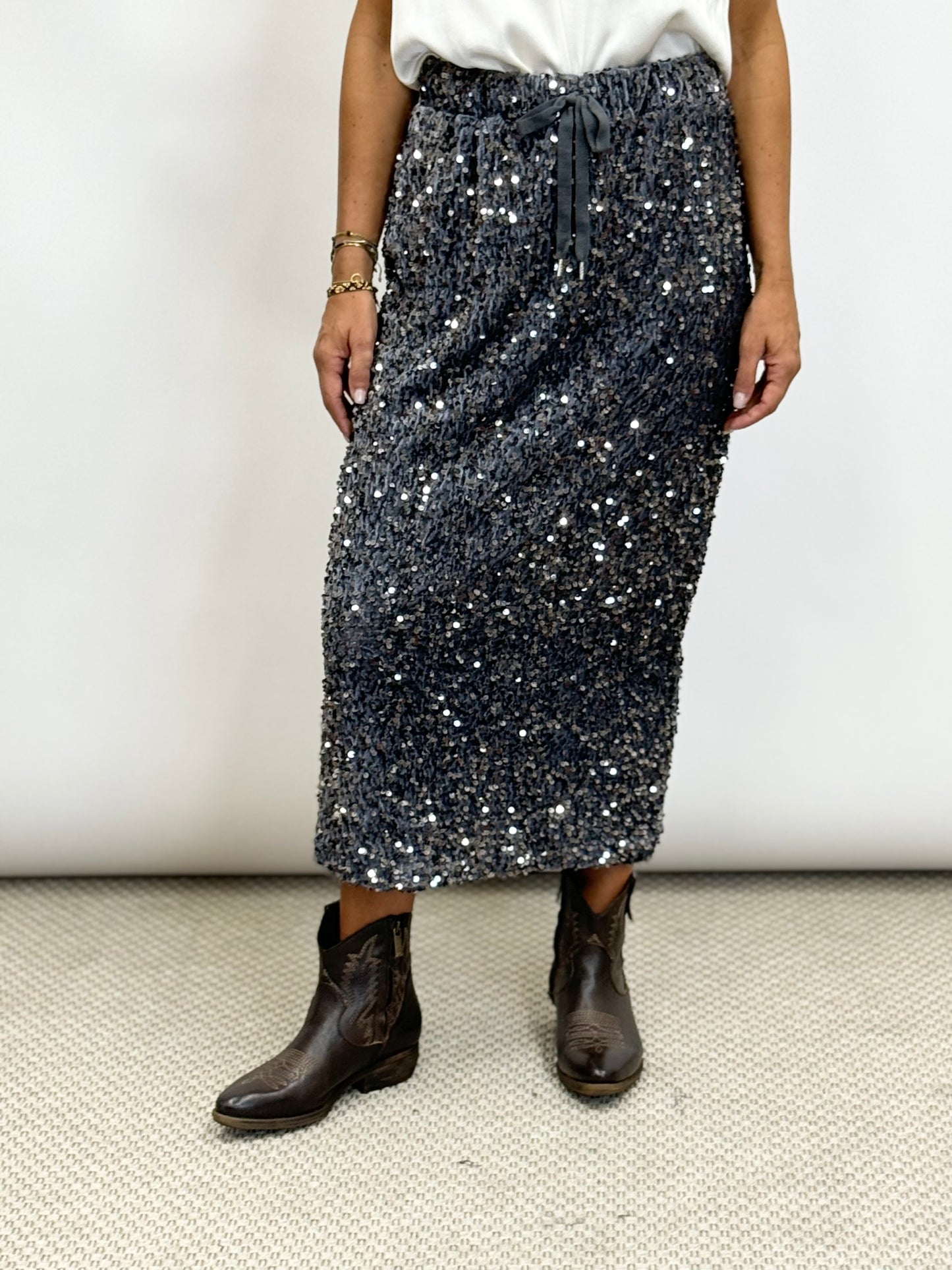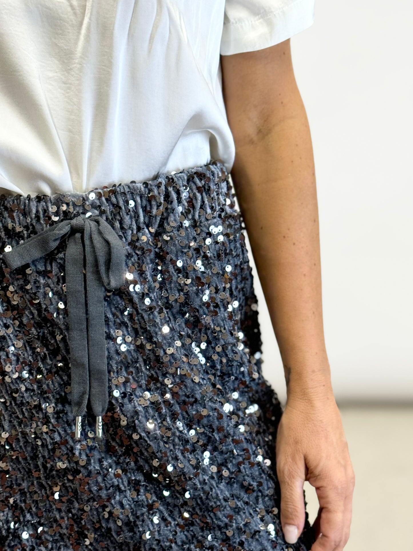 Gonna midi in ciniglia con paillettes, cinturino con elastico in vita e coulisse. Foderata. Basteranno indossarla in combinazione alla sua felpa, altrimenti una T-shirt, una camicia coordinata cromaticamente o in una sfumatura affine per tono e mood casual ma ricercato.