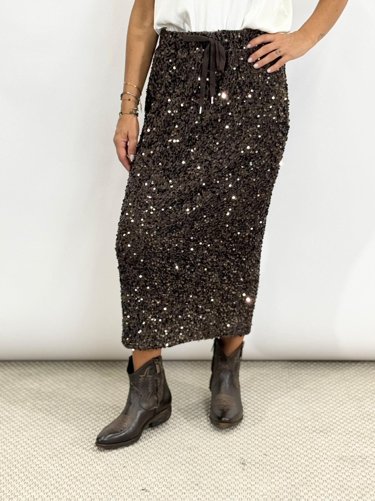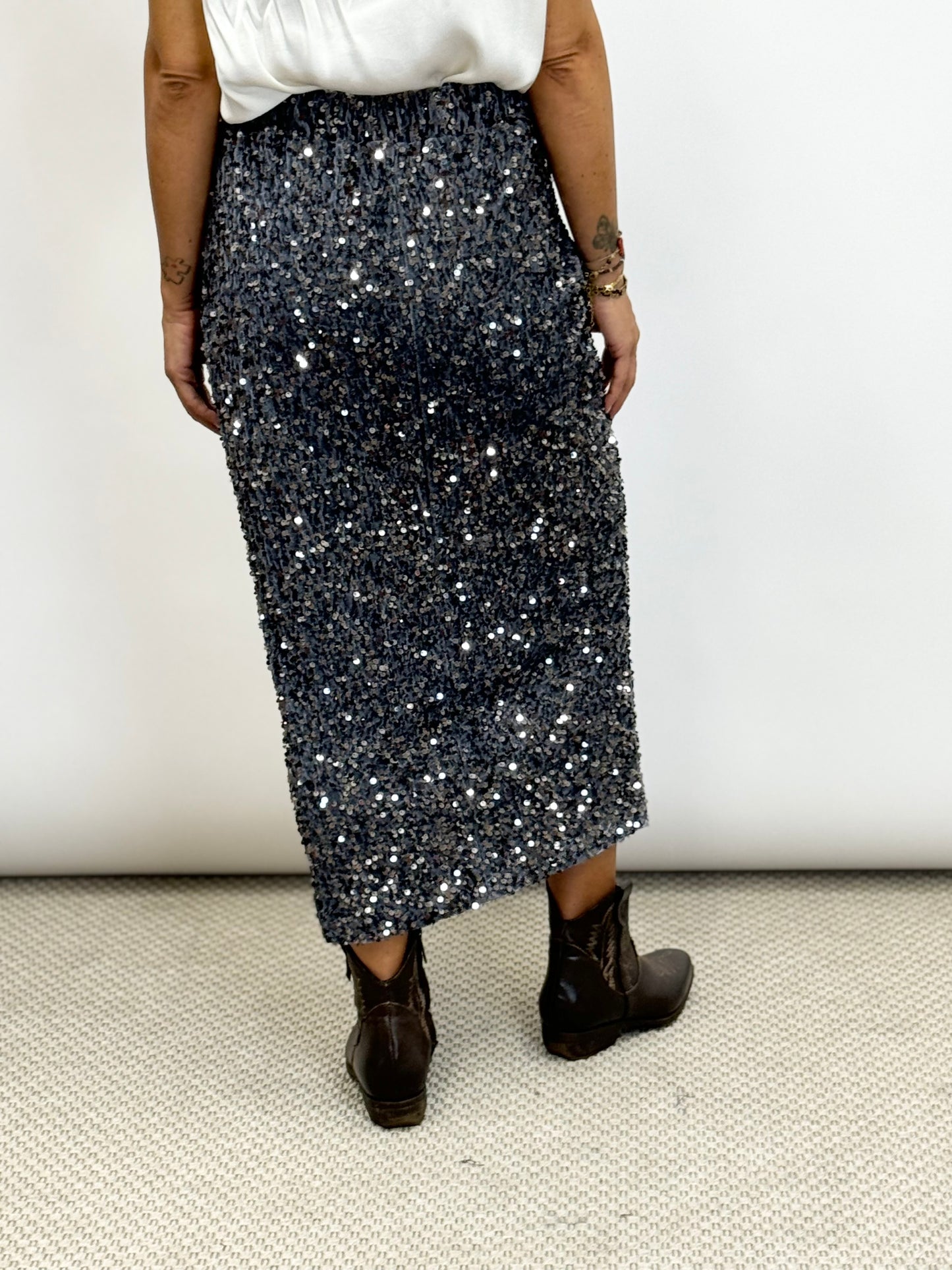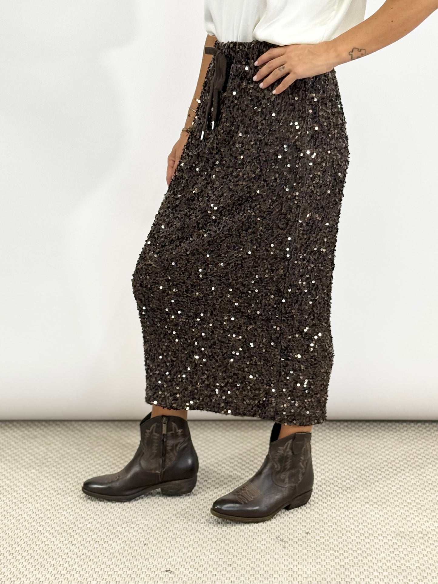 Gonna midi in ciniglia con paillettes, cinturino con elastico in vita e coulisse. Foderata. Basteranno indossarla in combinazione alla sua felpa, altrimenti una T-shirt, una camicia coordinata cromaticamente o in una sfumatura affine per tono e mood casual ma ricercato.