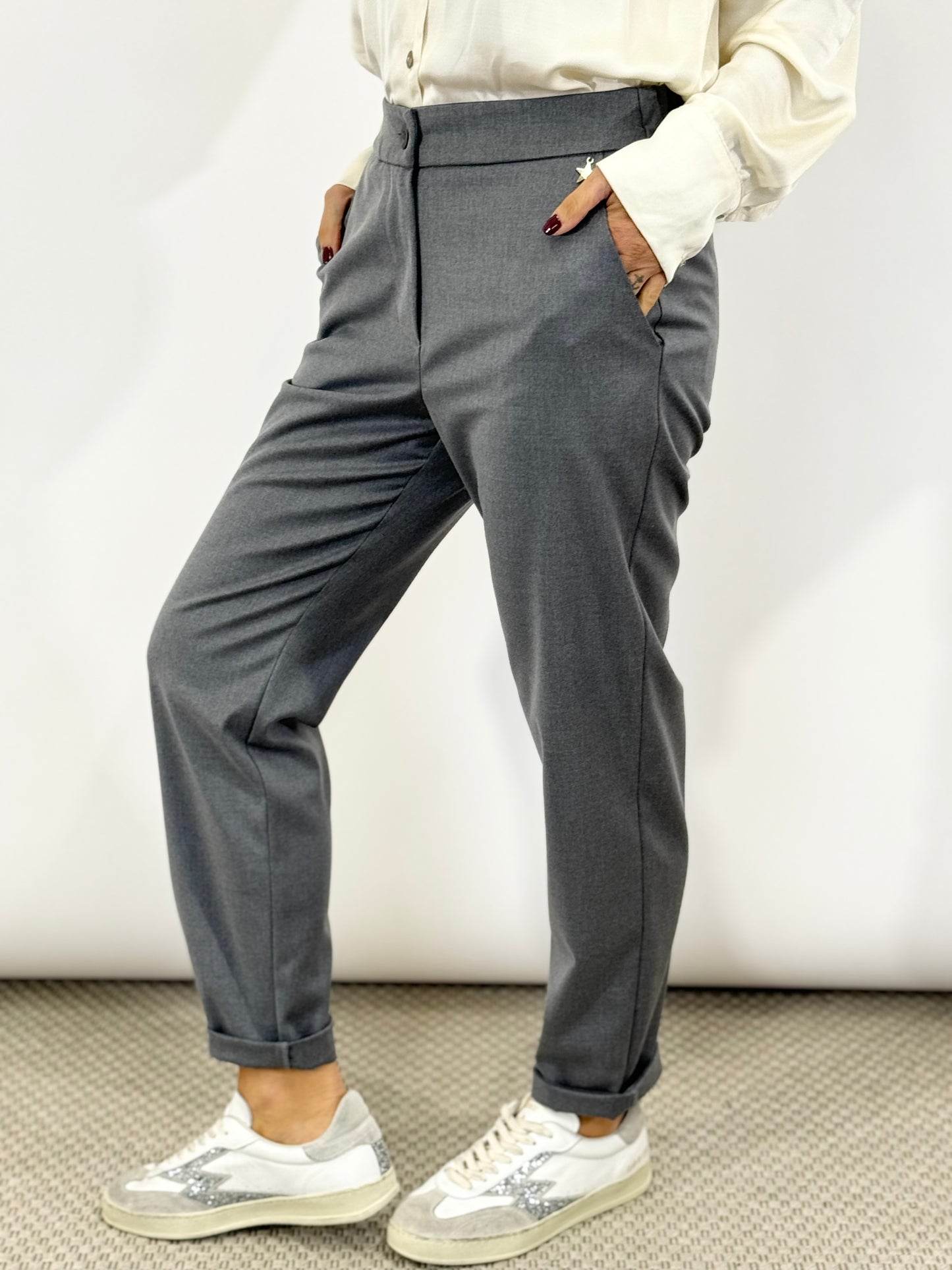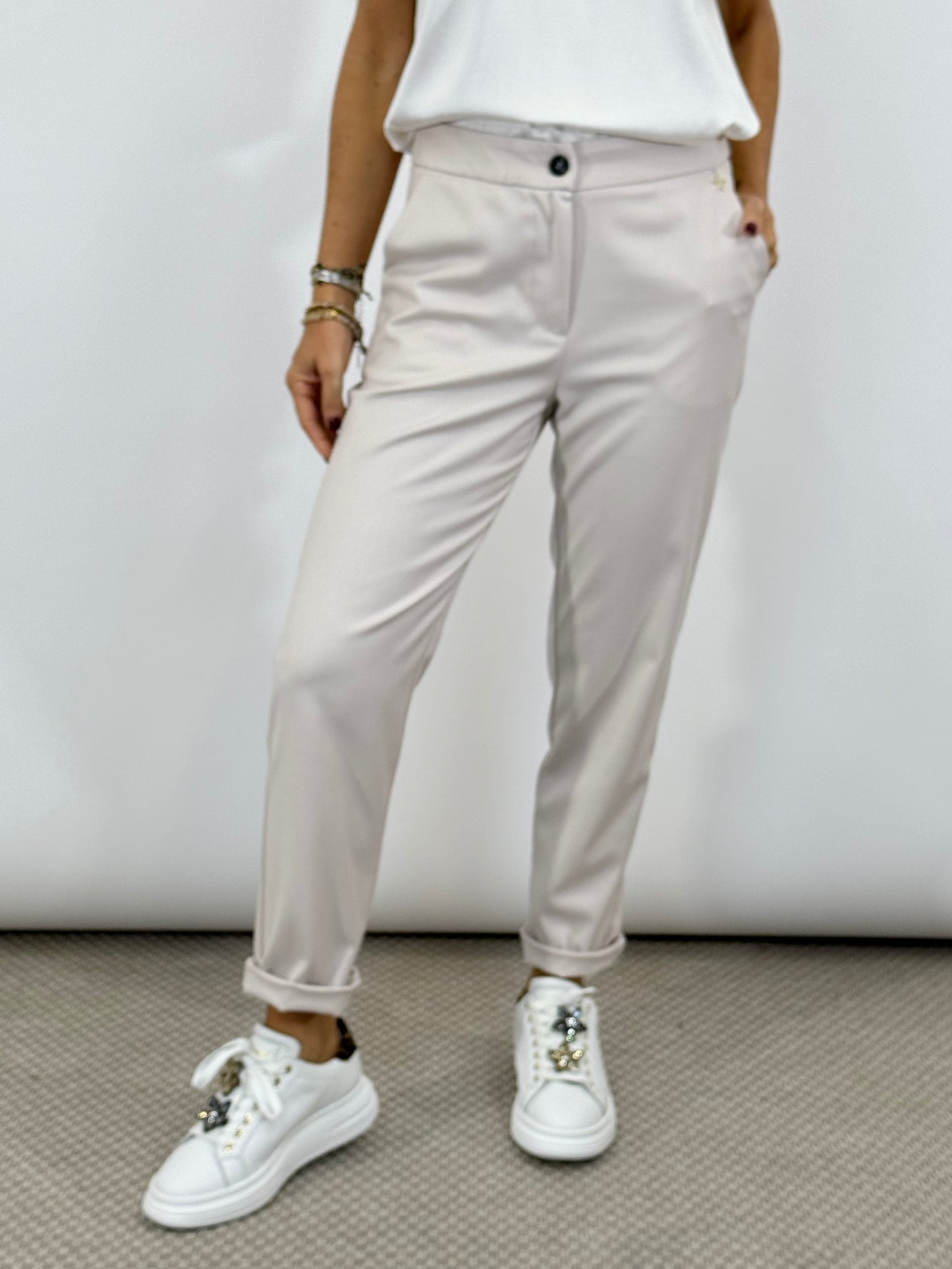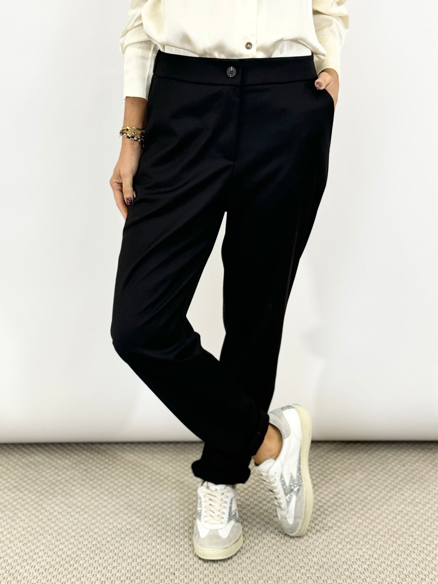 Pantalone basico, cinturino con elastico dietro e fermo davanti, tasche a filo davanti morbido , leggermente a stingere al fondo.